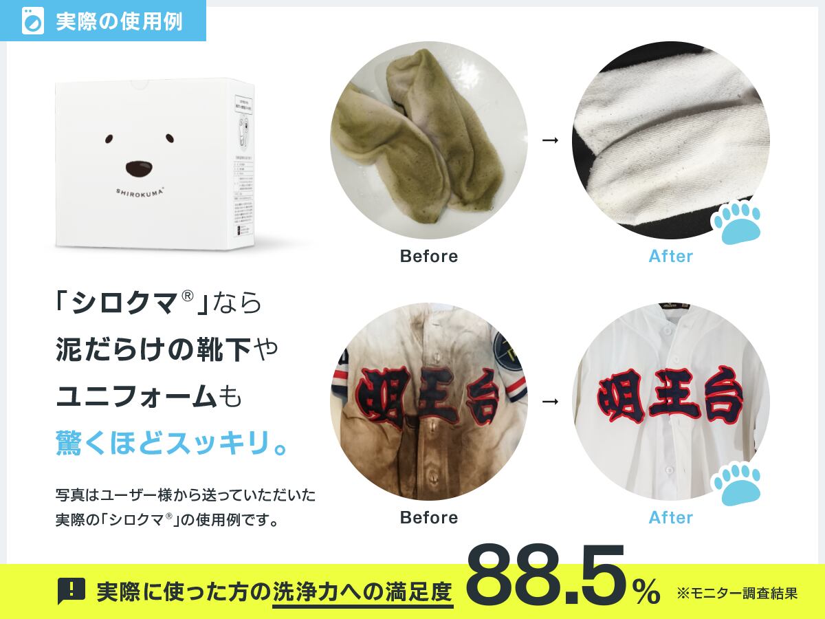 ガンコな泥汚れを徹底的に研究して作られた「シロクマ」。洗浄性の高い活性剤が、汚れを落とす優れた力を発揮します。野球やサッカー、ラグビーなどの練習や試合で活躍するユニフォームや靴下の泥汚れは「シロクマ」が解決します。